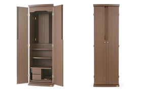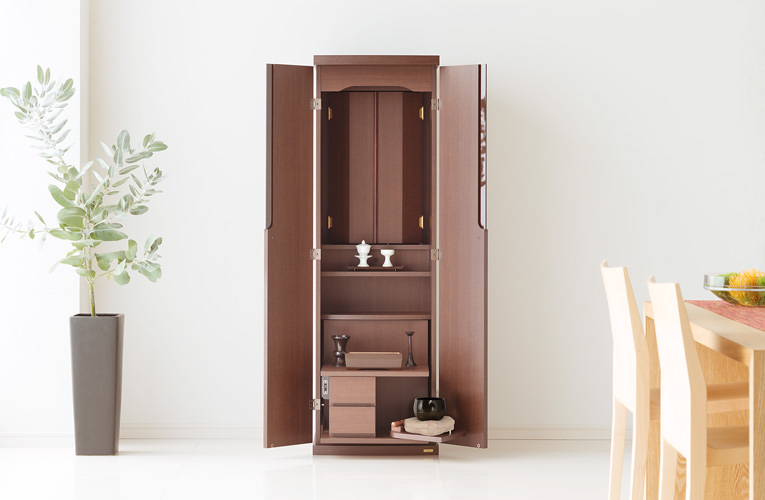 1483ブラウン-“妥協せずにここまで仕上げました。”落ち着いた雰囲気と高級感漂う外観に加えて、この価格で厨子扉に下置き式モーターの電動開閉を実現しました。御本尊様を御安置するのに妥協しない構造とデザイン、どこにも負けないロープライスが人気の理由です。