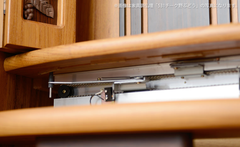 大切にしたのは厨子扉を開閉するモーターの位置。仏壇業界で主流の上置きモーターは、御本尊様の頭に機械を置いた形。目に見えない所にもこだわる金剛堂では、全てのお仏壇が御本尊様の下にモーターが置かれるように設計されています。