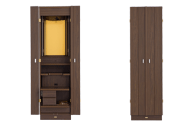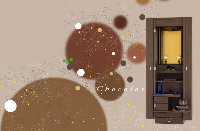 1542ショコラ-女性に人気の1541プルメリアに新しい色が加わりました。しっとりとしたブラウン色に包まれた1542ショコラはすべての人に安心感を与える落ち着いた雰囲気が魅力のお仏壇です。また各所にちりばめられたゴールドのアクセントがどこか華やかなイメージを演出しています。