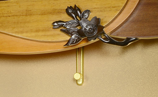 厨子欄間には、一つひとつ手作りで、丁寧に彫込んだ本黒檀の桜彫刻に、チーク・クリキス・ジャンプ材の無垢板を3枚合わせました。