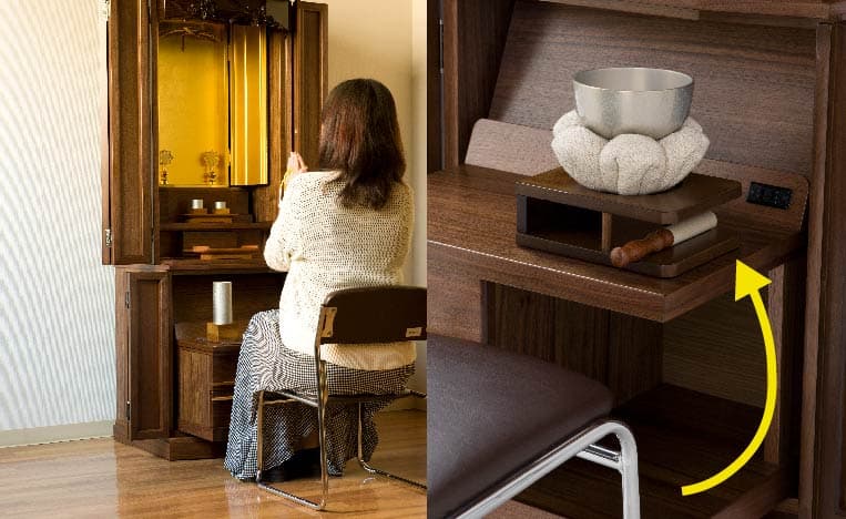 イスでも、正座でも。毎日の祈りにフィットする、独立したりん台がベンリです。