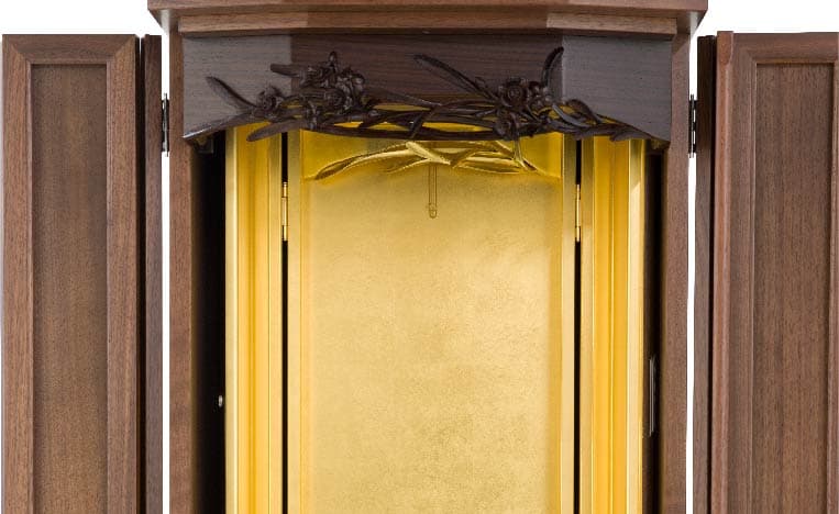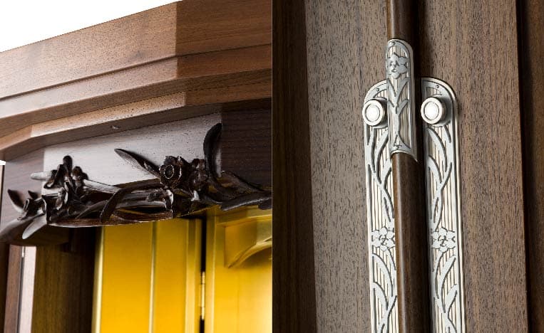 家具調ながら、ウォールナットの柔和なブラウンと木目が美しい金剛堂オリジナルのお仏壇。彫刻や金具は日本水仙をモチーフに製作。品の良いシンプルさと使いやすさを両立しました。