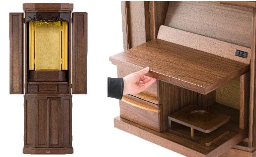 収納式の経机は安定感があり、仏具などを置いてご使用いただけます。使わないときは仕舞えて扉を閉めればスッキリと収めることができます。