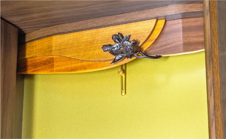 毎日の祈りを応援するために咲く、可憐な"さくら"は、世界有数のジャパラの彫刻師が一点ずつ丁寧に彫り上げた一級品。高級無垢材、チーク・クリキス・ジャンプの3種と組み合わせた欄間は、自然の恵みと芸術から生まれました。