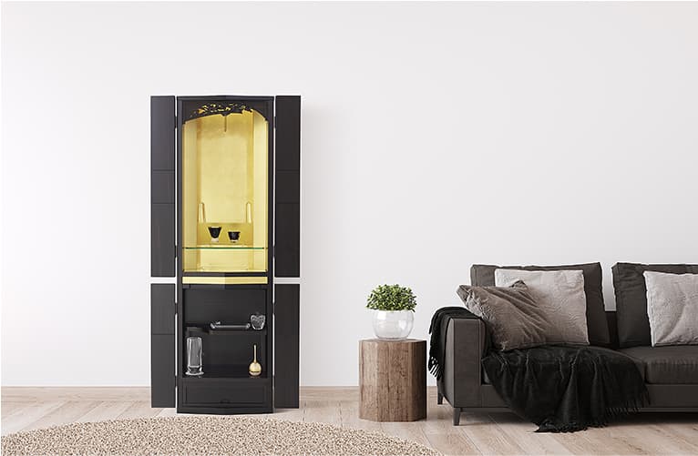 最高級の本黒檀の仏壇を、コンパクト&シンプルに仕立てました。限られたスペースを、満ち足りた祈りの空間に整えます。