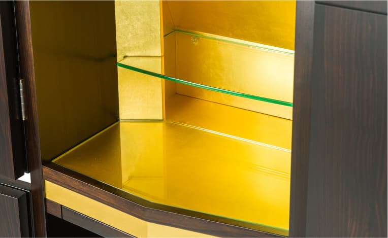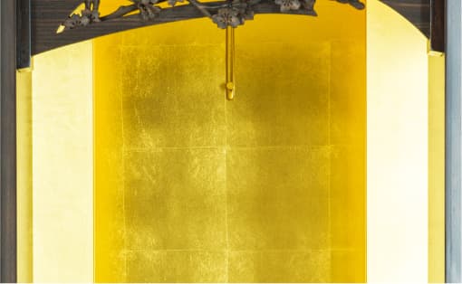 本黒檀の扉を開けると一転、本金箔で仕立てた光の世界に。月光に照らされたような金一色の美しさは、ご安置いただく御本尊様を、より一層荘厳し、祈りのときを美しく照らし出します。
