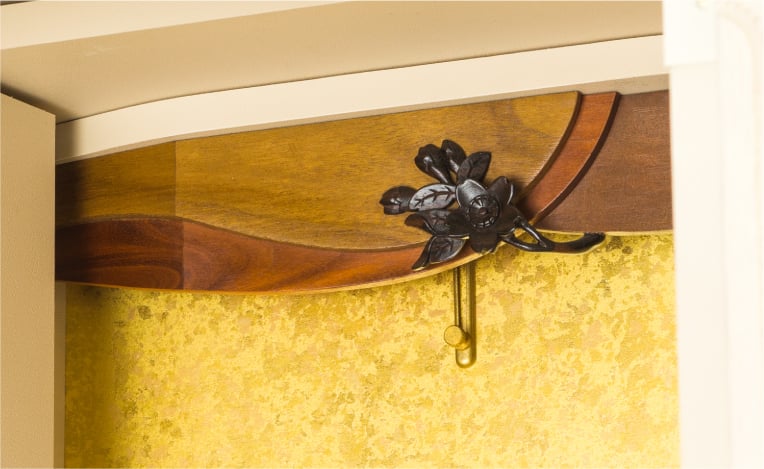 毎日の祈りを応援するために咲く、可憐な"さくら"は、世界有数のジャパラの彫刻師が一点ずつ丁寧に彫り上げた一級品。高級無垢材、チーク・クリキス・ジャンプの3種と組み合わせた欄間は、自然の恵みと芸術から生まれました。