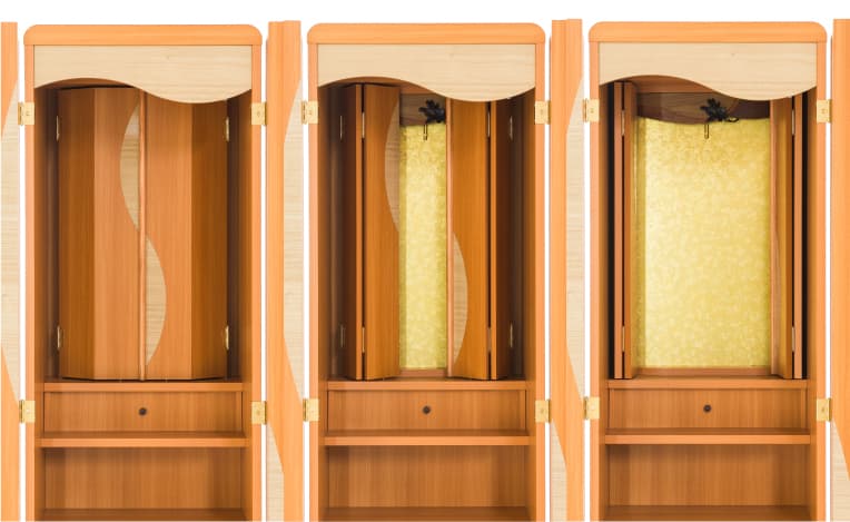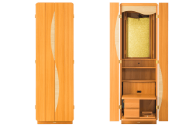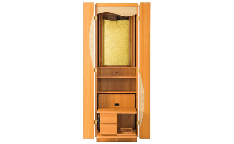 閉じても、祈っても。ナチュラルウッド調のボディに丸みのあるフォルムは、自然体でいて私らしさが垣間見える。扉を開けたら、経机の角も丸く、小さなお子様などにも安心です。