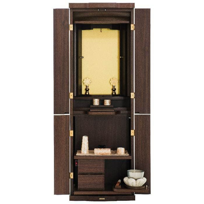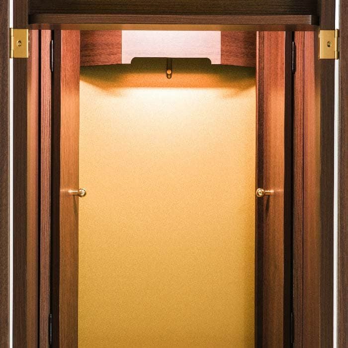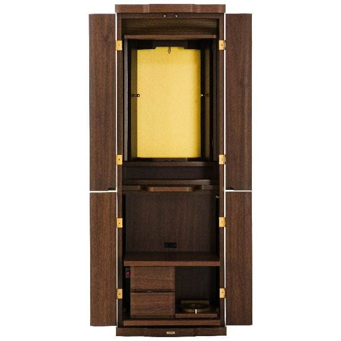 手開きの厨子扉がついた、スタンダードな家具調のお仏壇です。セパレート型で手動式のシンプルな造りは、お引越しが多い方などにもおススメです。落ち着いたカラーリングとシンプルながら高級感あるデザインはお部屋にしっくりとなじみます。
