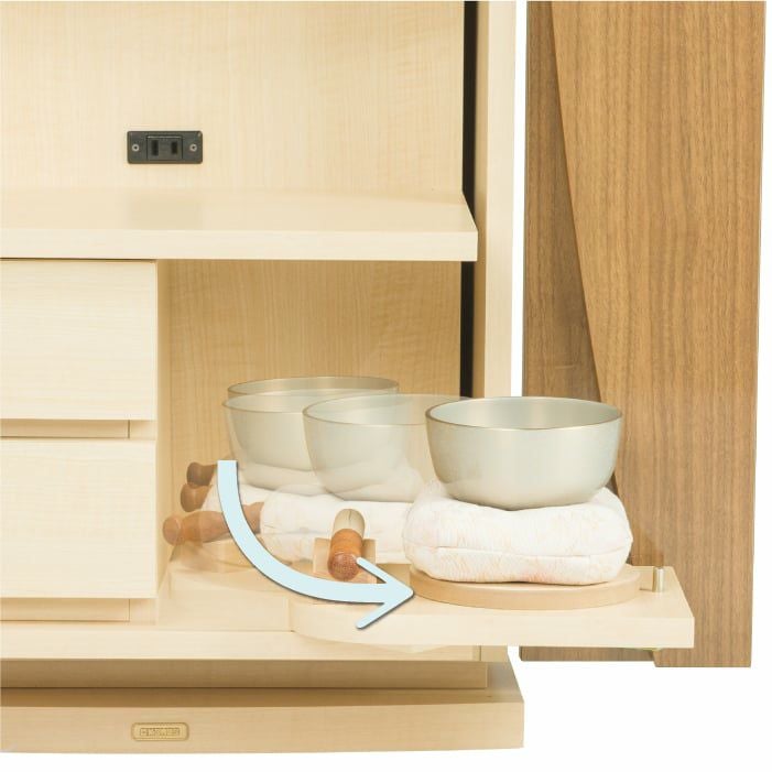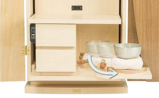 りん台はスライド式を採用。必要のないときはしまい、使うときには使いたい位置に出せます