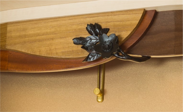 毎日の祈りを応援するために咲く、可憐な"さくら"は、世界有数のジャパラの彫刻師が一点ずつ丁寧に彫り上げた一級品。高級無垢材、チーク・クリキス・ジャンプの3種と組み合わせた欄間は、自然の恵みと芸術から生まれました。