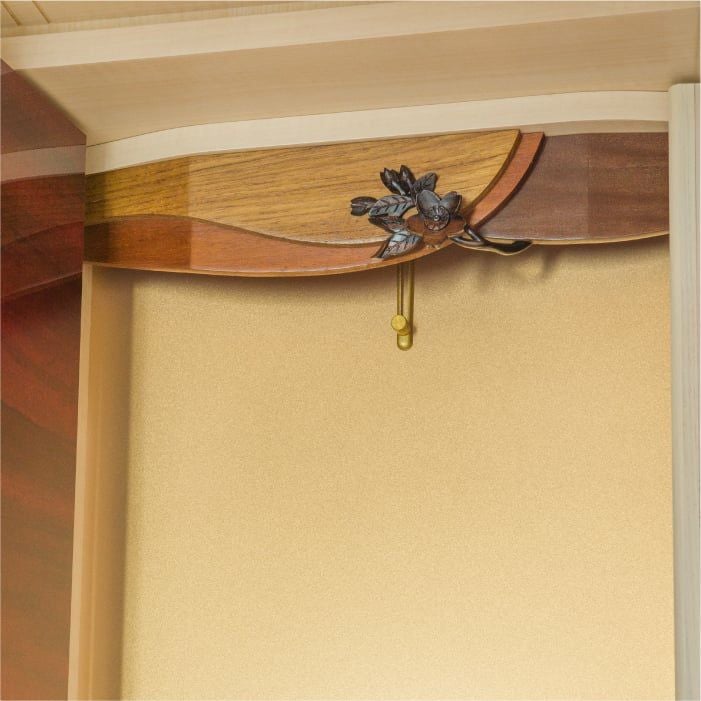毎日の祈りを応援するために咲く、可憐な"さくら"は、世界有数のジャパラの彫刻師が一点ずつ丁寧に彫り上げた一級品。高級無垢材、チーク・クリキス・ジャンプの3種と組み合わせた欄間は、自然の恵みと芸術から生まれました。