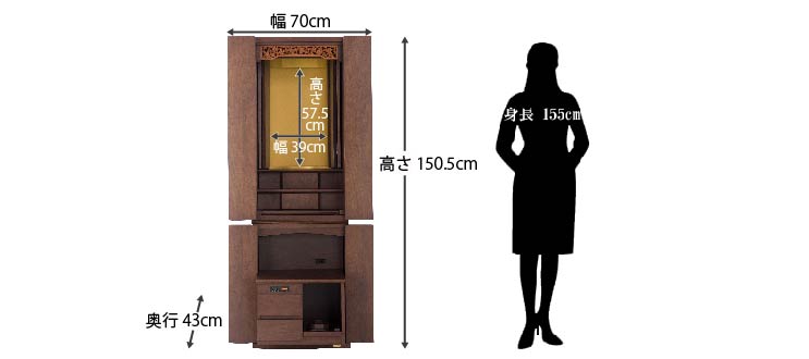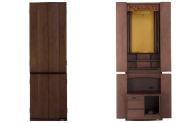 ウォールナットを使った、シンプルな閉じ姿が美しいお仏壇です。イスでも正座でも使いやすい、りんの位置が変えられる工夫がうれしいお仏壇です。