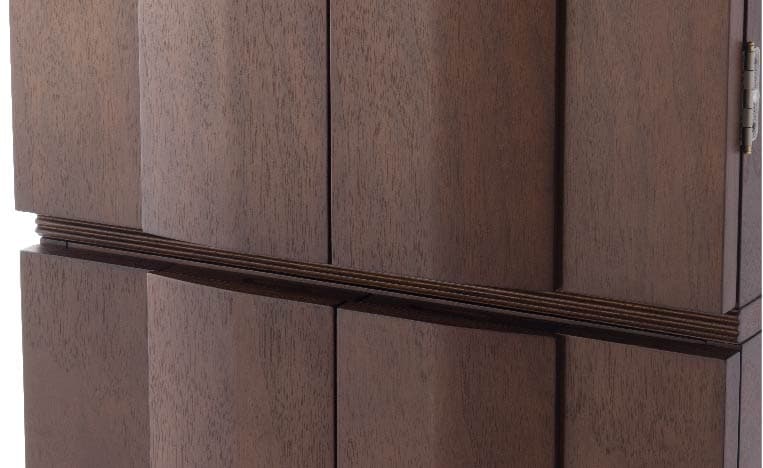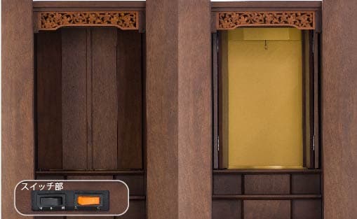 高級材・ウォールナットを使い、落ち着いた印象。あえて控えめなデザインで、電動式扉や彫刻ランマも搭載。欲しい機能が具わった、バランスの良いお仏壇です。