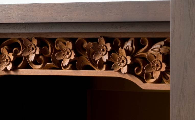 毎日の祈りをたえまなく続く、桜のモチーフと唐草を合わせたデザイン。マホガニ無垢材の温かさのみならず、丈が短くスマートさを感じます。