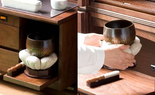 イスに座って祈るときは、膳引きを引き出すと、仏具も置ける経机に変身。りんも移動して使いやすい位置正座のときは、果物やお菓子などのお供えスペースに。