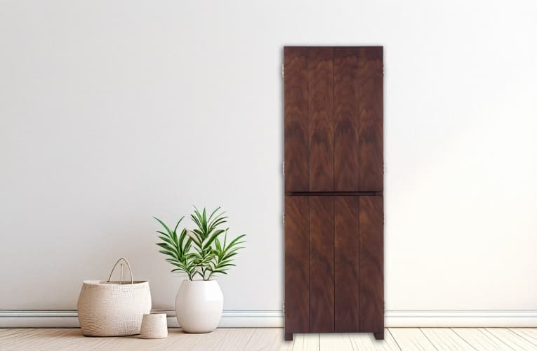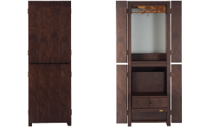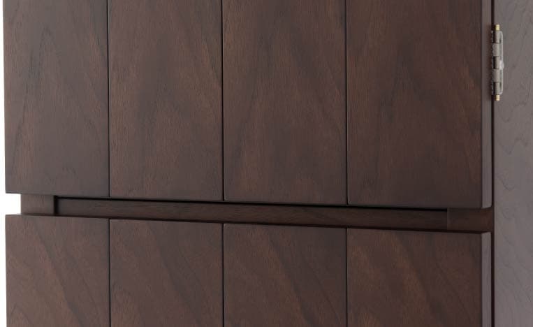 高級材・ウォールナットを使い、板目と柾目でダイナミックな木目を生かしました。閉じたときのデザインはシンプルにして使わないときも洗練されたデザインに。