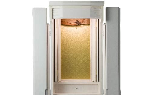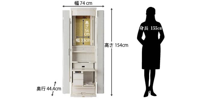 154cmの高さで、イスでも、正座でも安心して使えます。扉が大きく開き、御本尊様を大切にお納めする作りはそのままに、空気のように、”軽やかに、祈る”姿を想像しながら仕立てました。