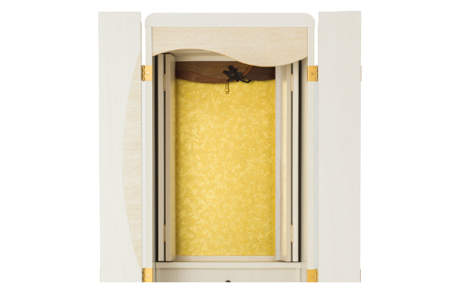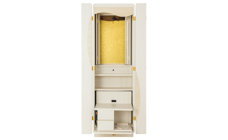 閉じても、祈っても。ホワイトのカラーリングと丸みのあるフォルムは、シンプルでいてジブンらしさが光るデザイン。扉を開けたら、経机の角も丸く、小さなお子様などにも安心です。