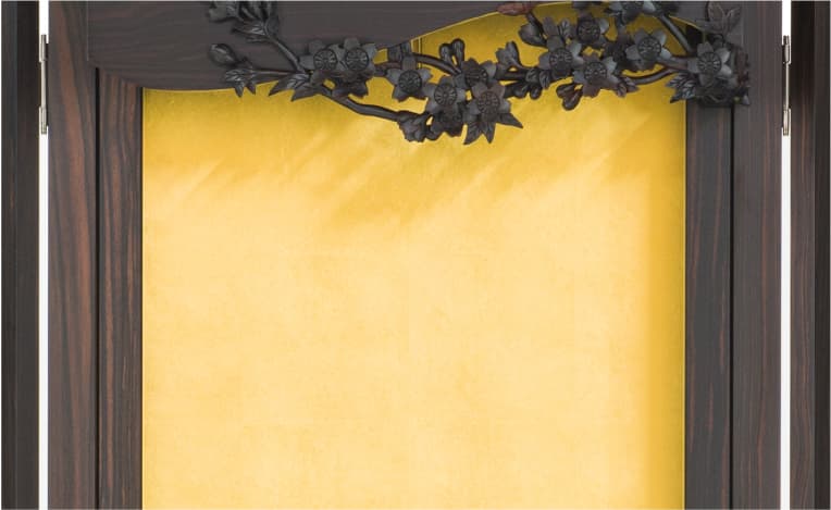 コンパクトでありながら、伝統型特有の落ち着いた雰囲気を持つ、風格漂う仏壇です。欄間の柔らかなカーブに桜が咲き薫る、上品な彫刻が愛されています。