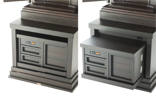 りん収納部は、コンパクトにしまえて、たたきやすい位置まで引き出せる設計。普段ご使用にならない時は、大戸を閉めることでフタができ、ホコリを防ぎ、すっきりと美しい外観を保てます。