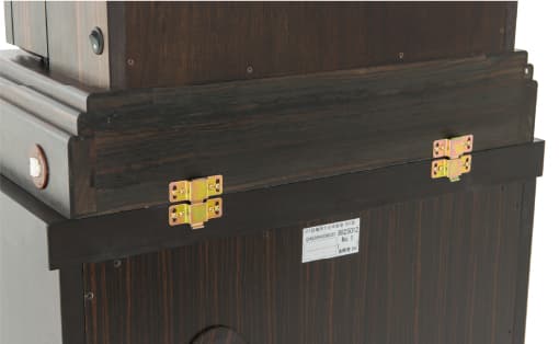 お仏壇の背面に耐震金具(MKロッキー)を装着して、上台と下台を固定しています。上台が下台から滑り落ちるのを防ぎ、地震対策になるので安心です。