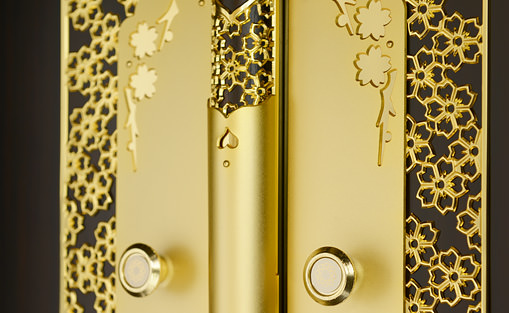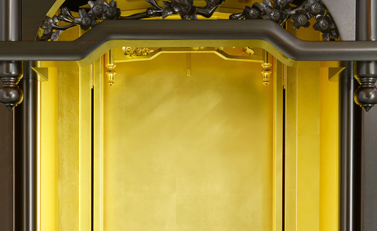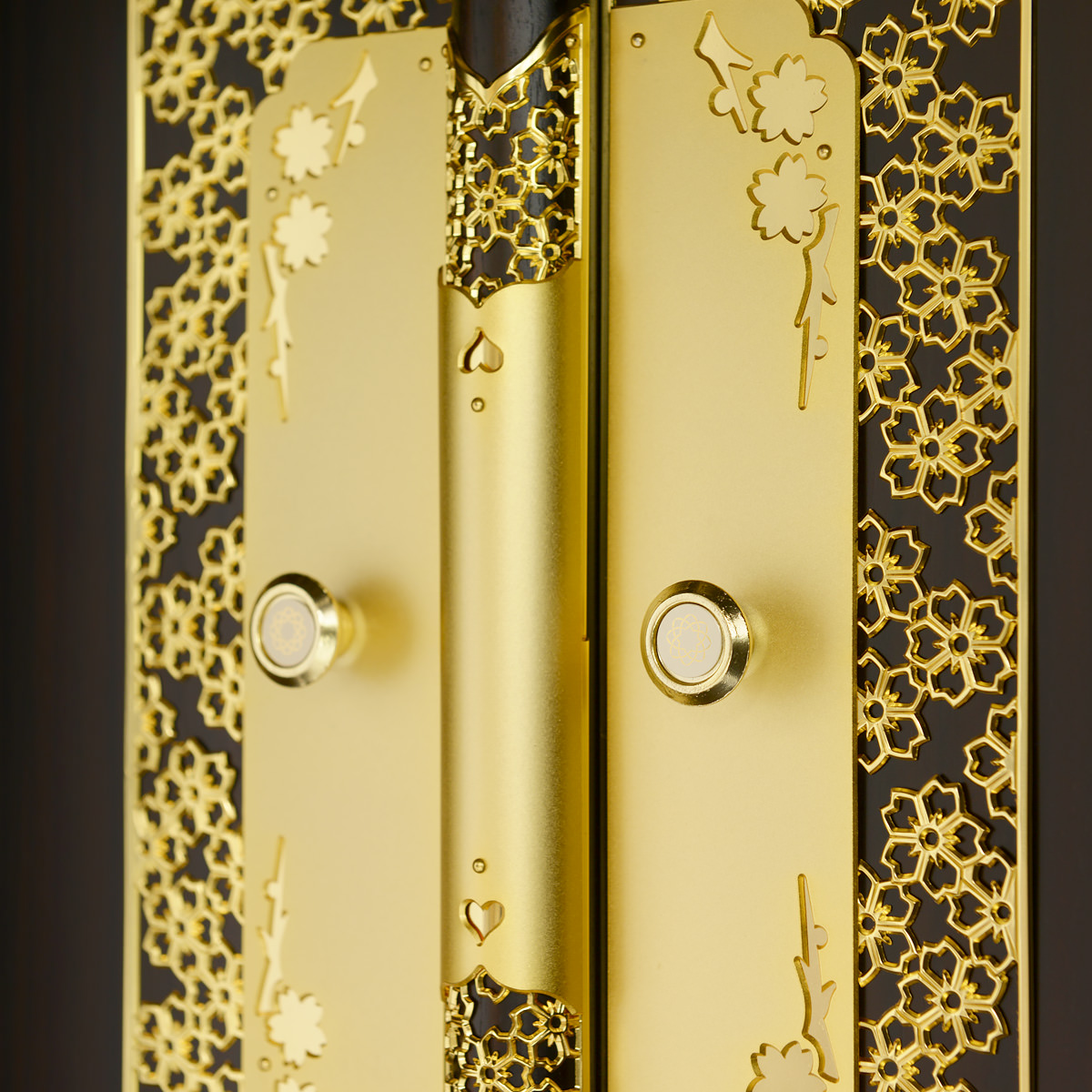 最も多くの仏壇に採用されている桜模様の透かし彫りの金具は、本金メッキも上品なつや消しで丹念に仕上げています。お仏壇の中心部で全体を引き締める特上の金具です。