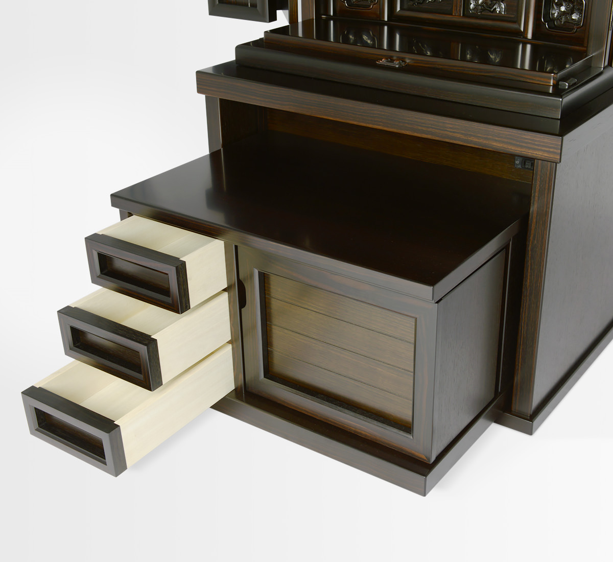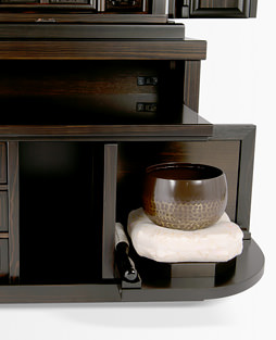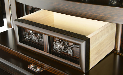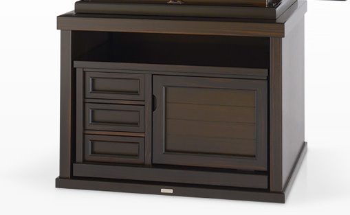 お仏壇の中段部(お厨子の下付近)に収納がついています。普段はあまりご利用にならない大切に保管しておきたいものを収納するのに最適です。