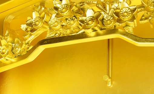 高貴な輝きに溢れた厨子。施された本金箔は、温度や湿度に左右されることなく、何百年、何千年と輝きが失われることはありません。伝統工芸を今に受け継ぐ金箔師の技が冴え永遠の輝きが御本尊様を荘厳します。