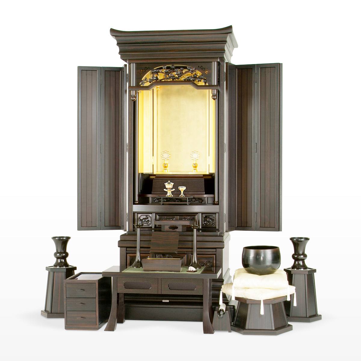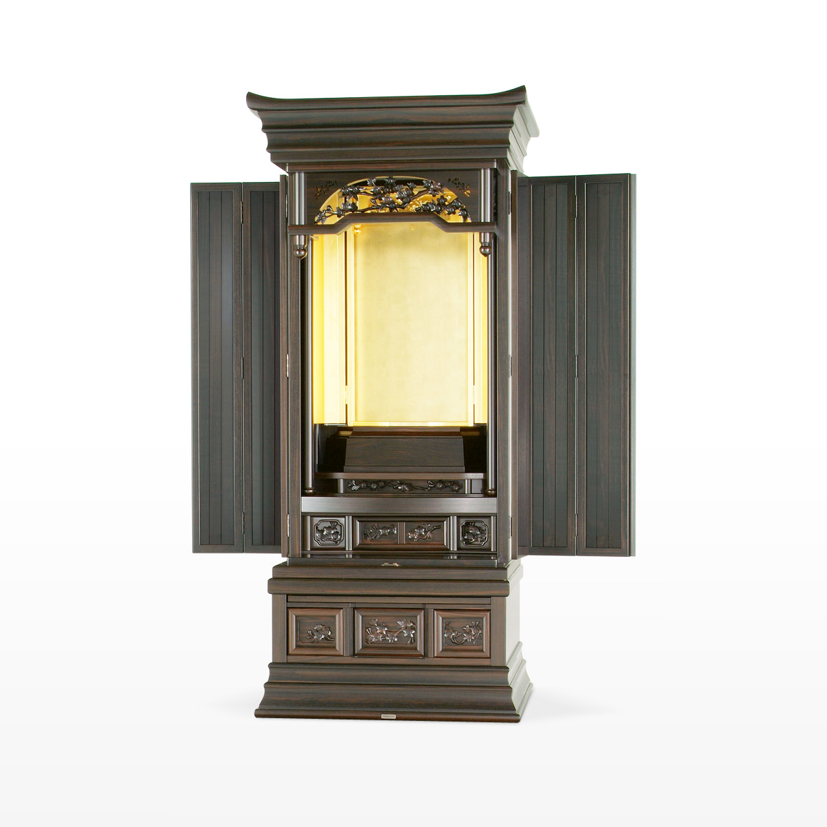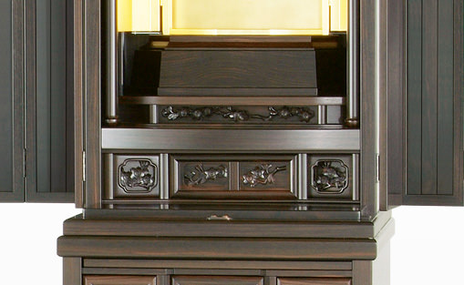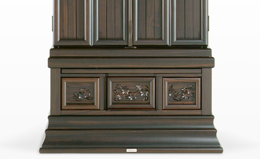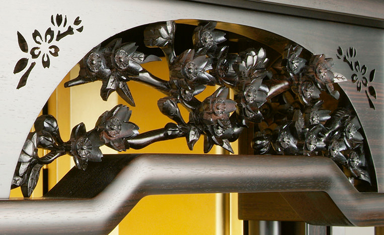 20本黒檀金剛桜-無垢の本黒檀を採用した伝統型仏壇としてはもっとも人気の高い、正三方のロングセラーモデルです。欄間に金剛桜の彫刻を備えたシリーズの中で一番コンパクトに設計されたモデルでありながらその重厚感はしっかりと受け継がれています。