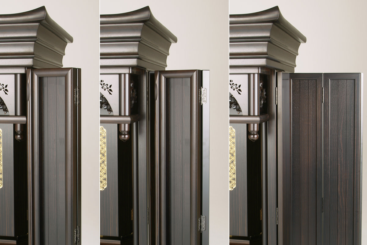 大戸は正三方開きを採用しました。障子がなく大戸のみが広く三方に開きます。大きく開いたときは御本尊様を拝せる角度が広角になり、大人数での勤行・唱題にピッタリ。
