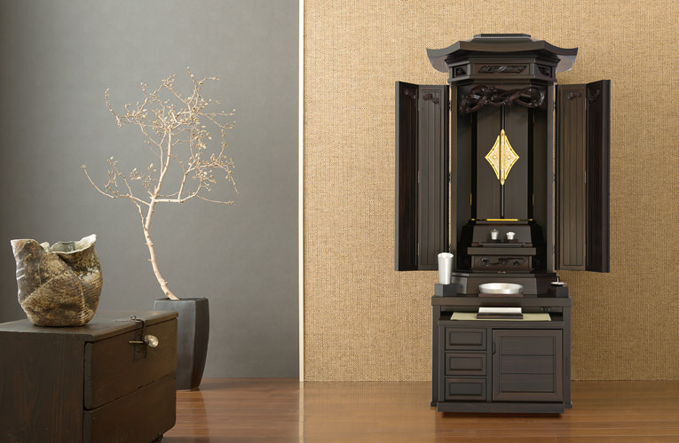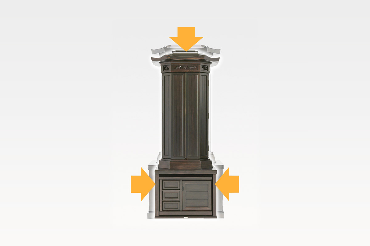 収納式の厨子型仏壇としては、このクラスで最もスリムな横幅63.5cmを実現し、クオリティーの高いコンパクトボディーが魅力です。