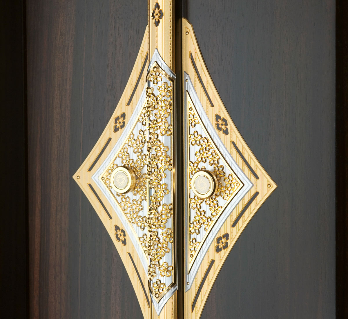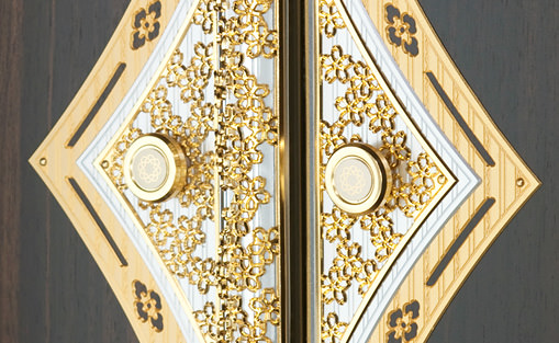 厨子金具は特別に開発した金具を使用。金メッキとロジウムメッキのツートンカラーのたて縞模様をベースに桜模様をあしらった金具は、斬新な中にも品位を感じる逸品です。