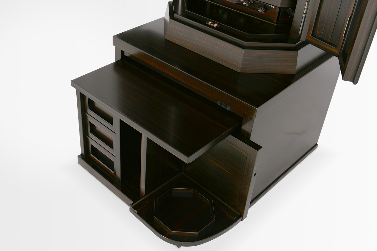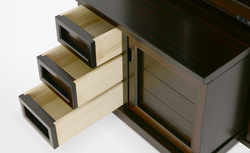 収納式の経机には3ヵ所の引出しがついています。日々、ご利用になられるお念珠やお経本などを収納するのにとても便利です。