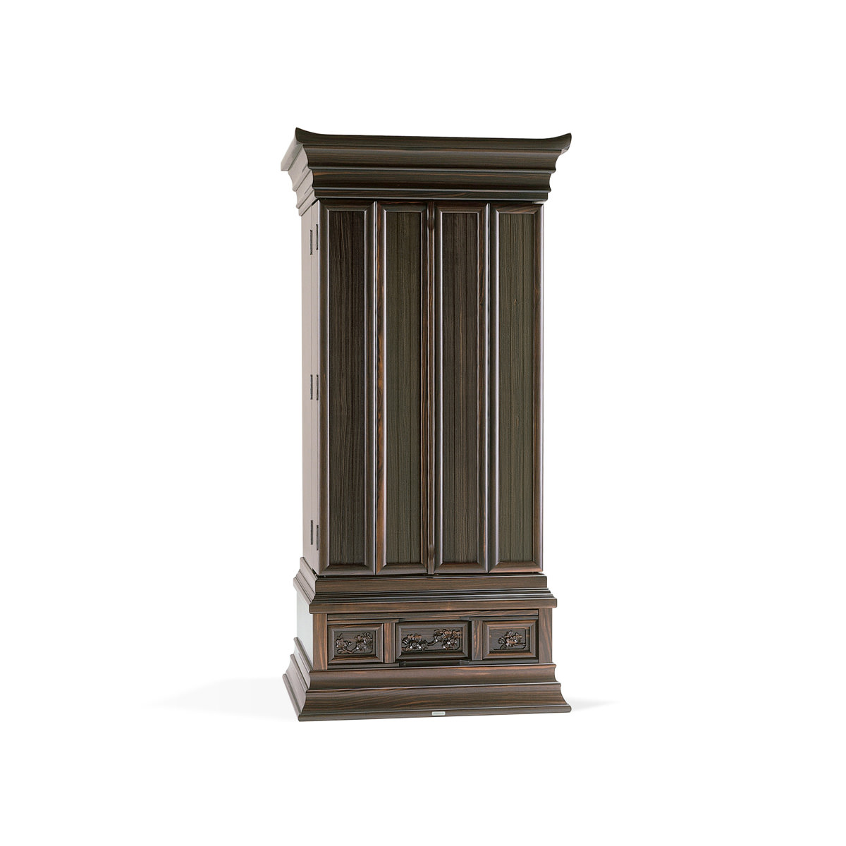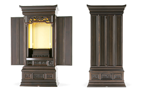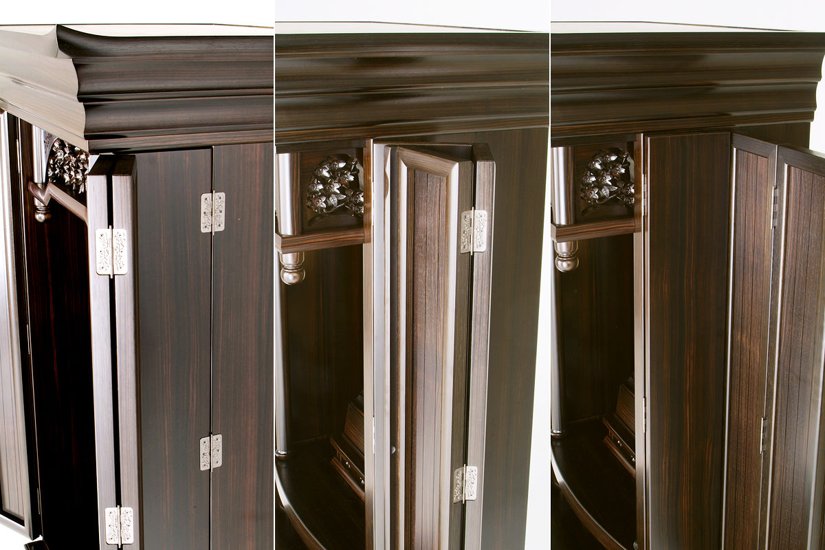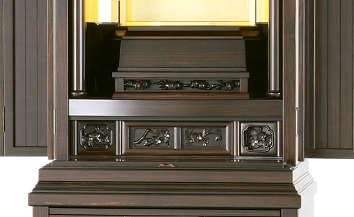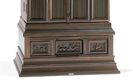 22本黒檀金剛桜-人気の高い金剛桜の彫刻を備えた22黒檀は高さと幅の良い正三方の上位モデルです。大戸の戸板はムクにこだわり、連戸式を採用。厨子内の本金箔の輝きとシンプルでありながら圧倒的な立体感を持つ彫刻が本物だけが感じさせる安心感を与えてくれます。