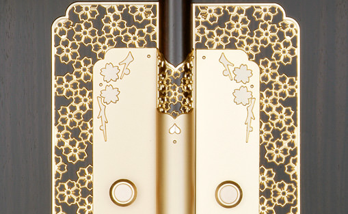 最も多くの仏壇に採用されている桜模様の透かし彫りの金具は、本金メッキも上品なつや消しで丹念に仕上げています。お仏壇の中心部で全体を引き締める特上の金具です。