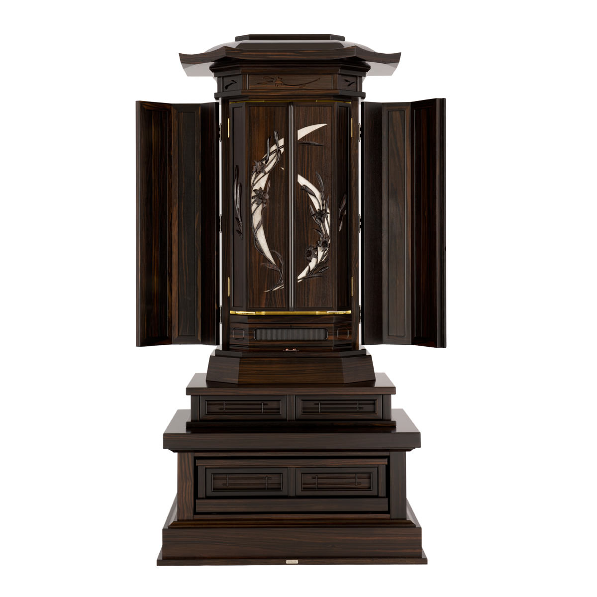 25本黒檀白ゆり-白ゆりの花の彫刻が印象に残る黒檀製厨子型仏壇です。戸板は無垢にこだわり、連戸方式を採用。背景にプラチナ箔を配した厨子戸の彫刻は、大胆な構図の力強さを感じますが、繊細な彫刻技術は強さが合わせ持つしなやかさと優しさをみごとに表現しています。