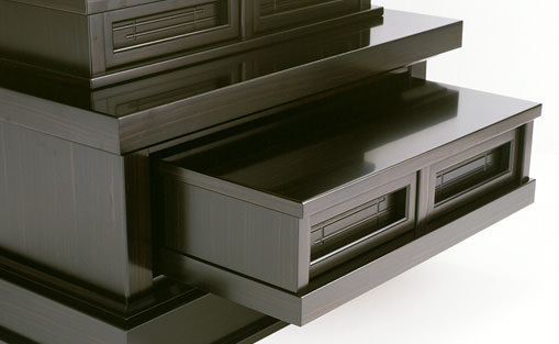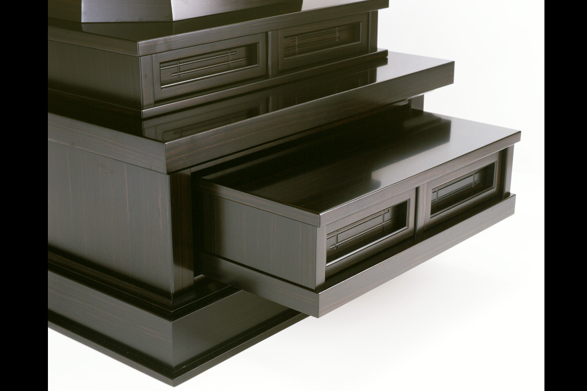 お仏壇の中段部(中間台)には大容量の引出しがついています。普段はあまりご利用にならない大切に保管しておきたいものを収納するのに最適です。