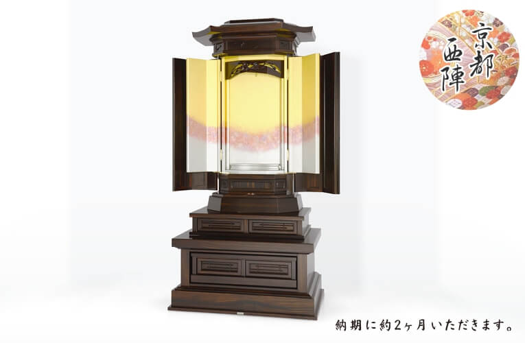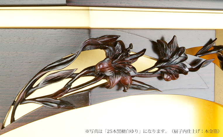 25本黒檀白ゆり西陣仕様-人気の25本黒檀白ゆりの厨子内を京都西陣で仕上げた、風情たっぷりの別注仏壇です。背景にプラチナ箔を配した厨子戸の彫刻は、大胆な構図の力強さを感じますが、繊細な彫刻技術は強さが合わせ持つしなやかさと優しさをみごとに表現しています。