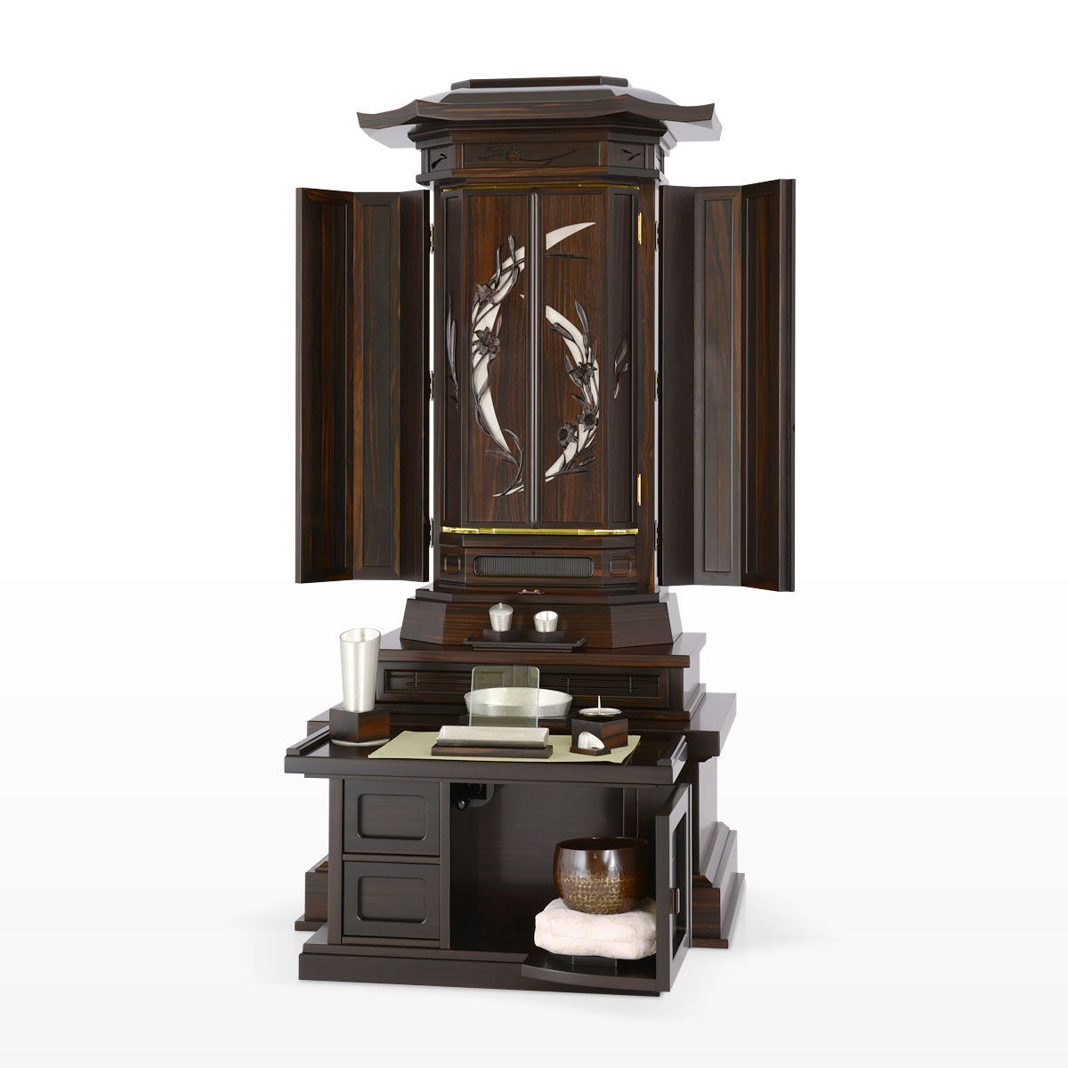 背景にプラチナ箔を配した厨子戸の彫刻は、プラチナ箔の銀色と黒檀の色合いがマッチした落ち着きのある仕上がりです。