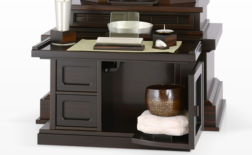 下台の引き出し部分は、そのまま引っぱり出せる構造になっています。りんなどもしまえる収納式タイプとは違いますが、簡単な経机がわりや、お供物をのせる時などにご利用いただけます。