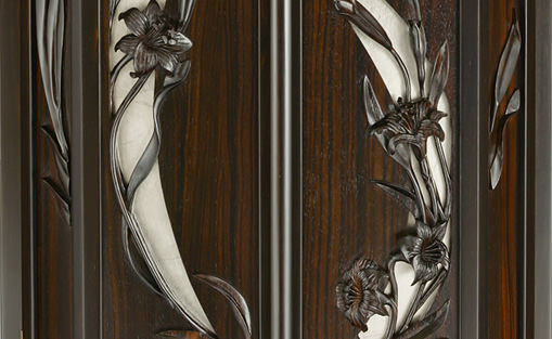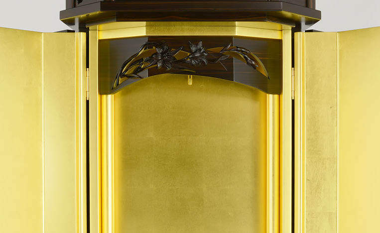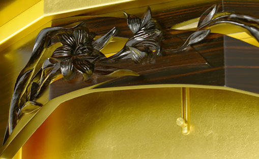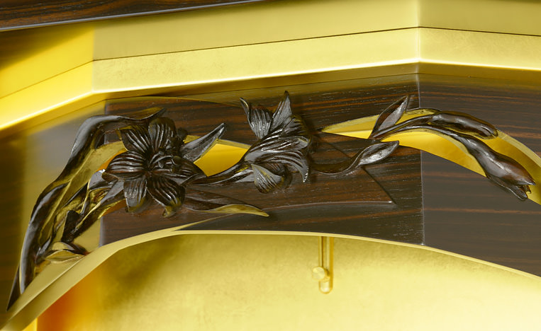 背景にプラチナ箔を配した厨子戸の彫刻は、プラチナ箔の銀色と黒檀の色合いがマッチした落ち着きのある仕上がりです。
