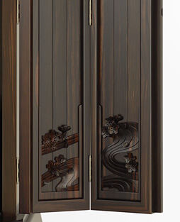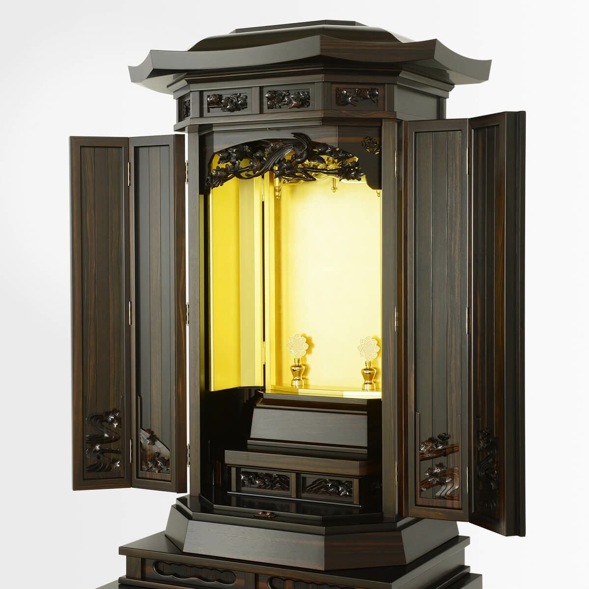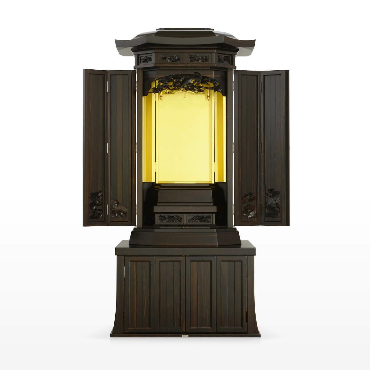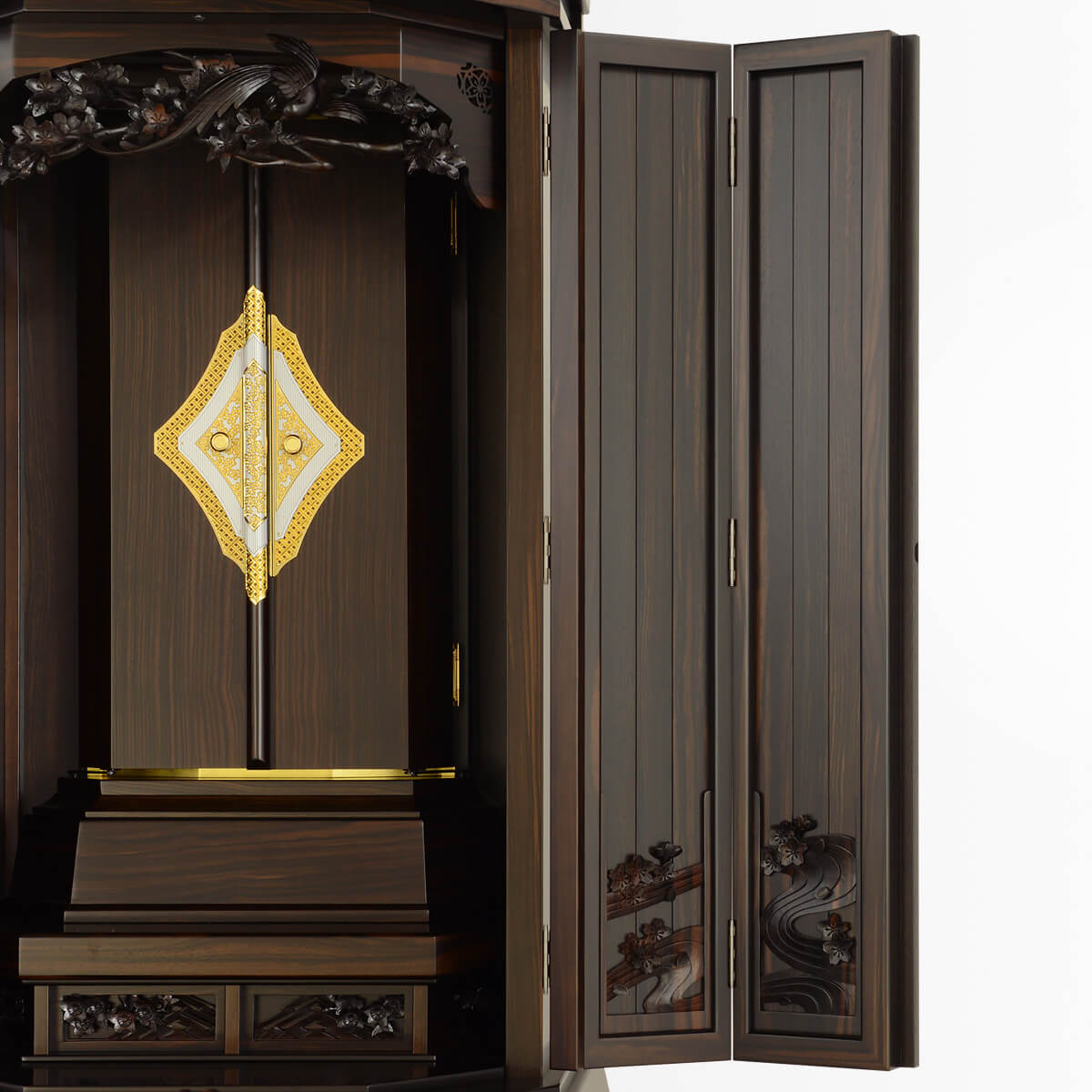 27本黒檀 収納式 尾長鳥-「27本黒檀 尾長鳥」の重厚感はそのままに、スリムさを追求した収納式の厨子型仏壇です。機能性に優れたスライド式の経机とりん台で、使い勝手も抜群。欄間彫刻は本黒檀無垢材で、尾長鳥が桜の上空を優雅に舞っている様子を立体的に彫り上げました。