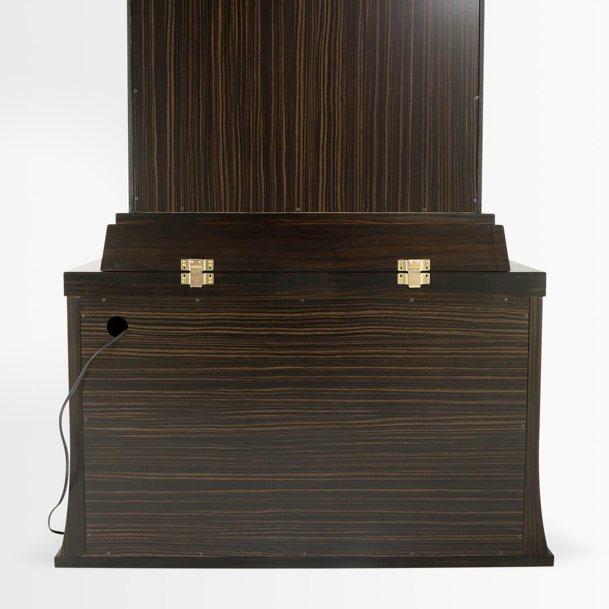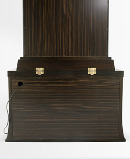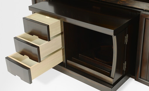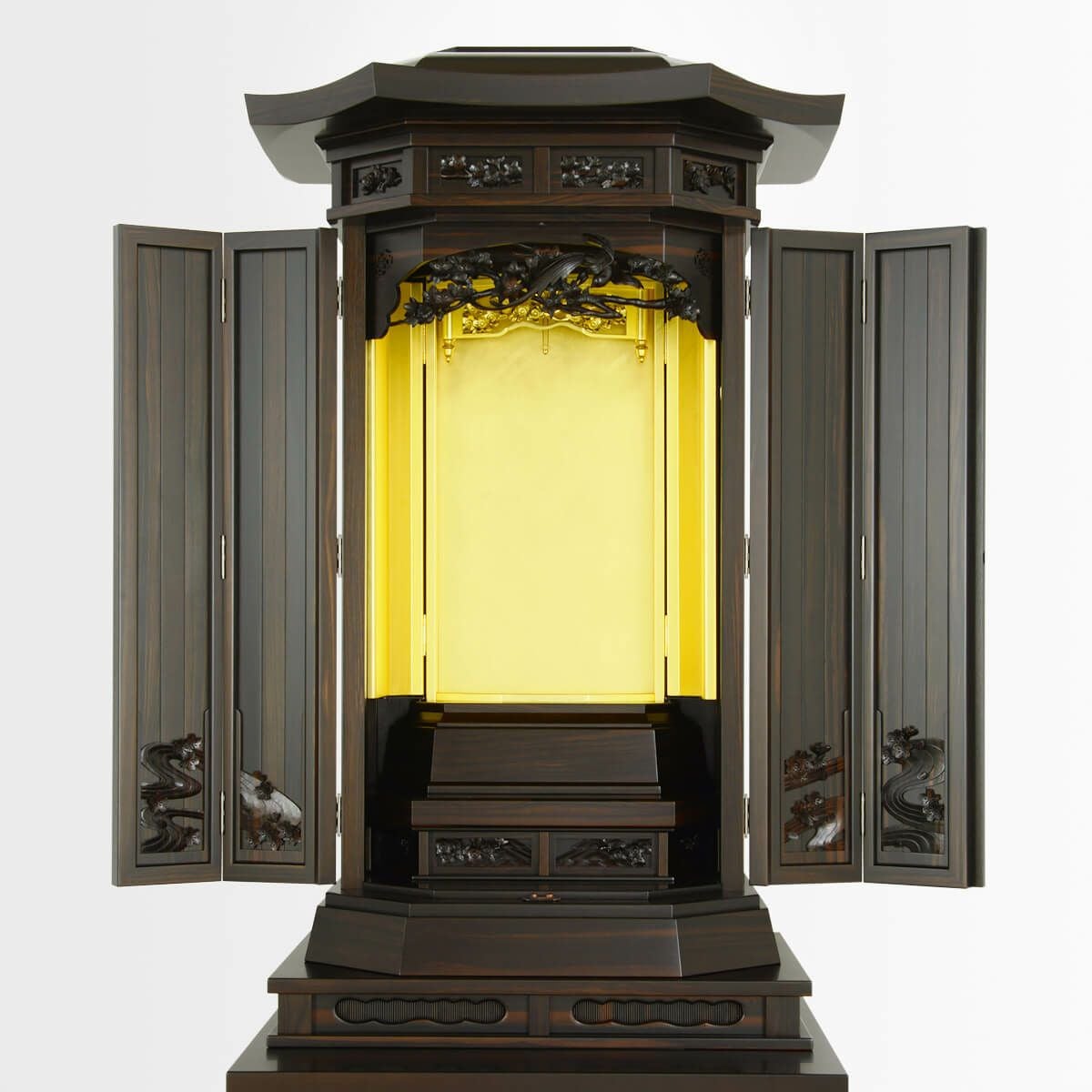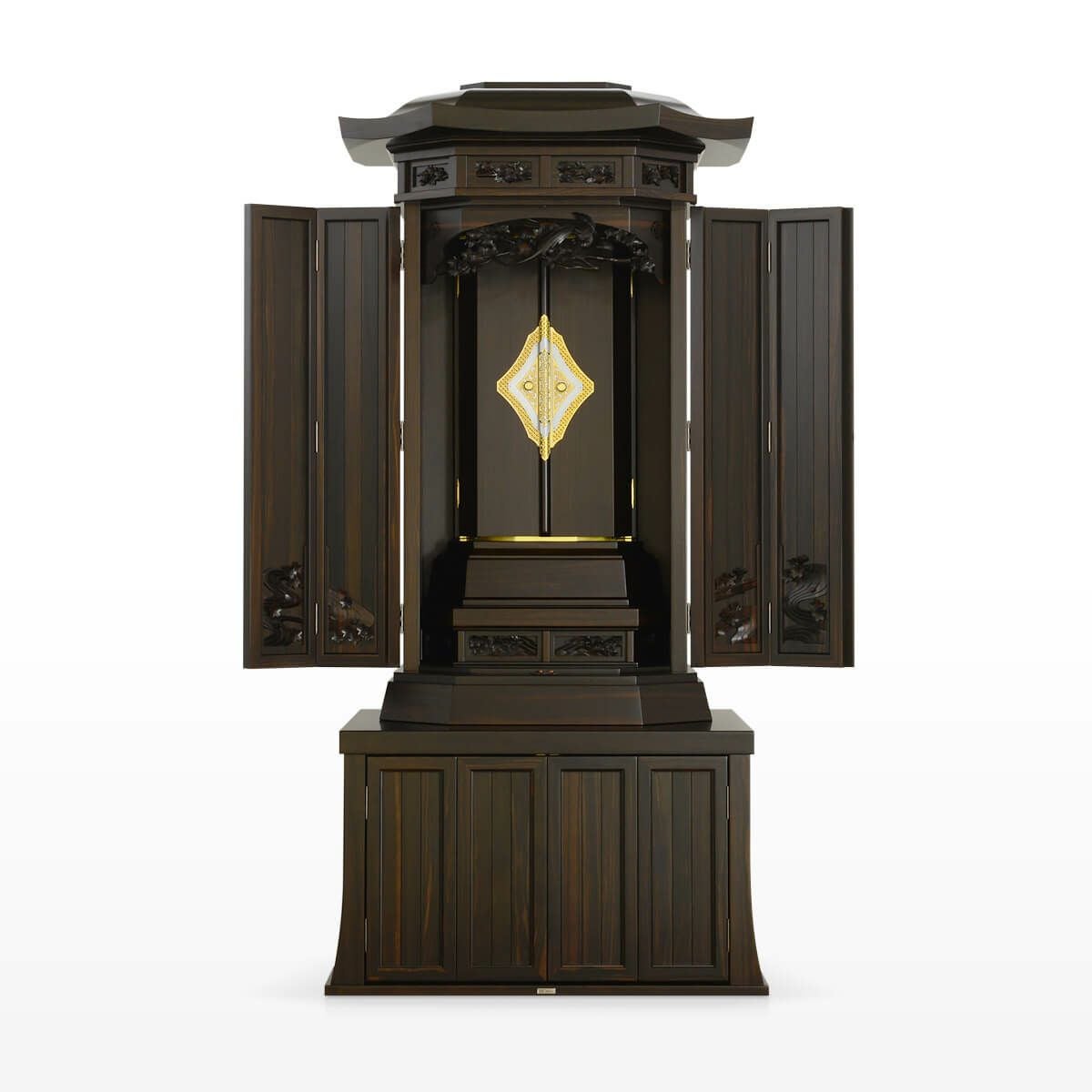 27本黒檀 収納式 尾長鳥-「27本黒檀 尾長鳥」の重厚感はそのままに、スリムさを追求した収納式の厨子型仏壇です。機能性に優れたスライド式の経机とりん台で、使い勝手も抜群。欄間彫刻は本黒檀無垢材で、尾長鳥が桜の上空を優雅に舞っている様子を立体的に彫り上げました。