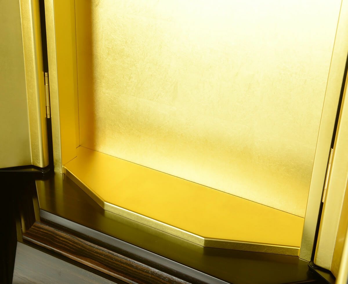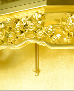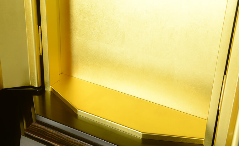 高貴な輝きに溢れた厨子。施された本金箔は、温度や湿度に左右されることなく、何百年、何千年と輝きが失われることはありません。伝統工芸を今に受け継ぐ金箔師の技が冴え永遠の輝きが御本尊様を荘厳します。