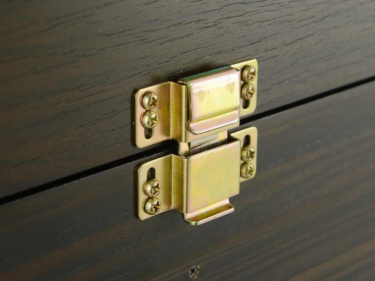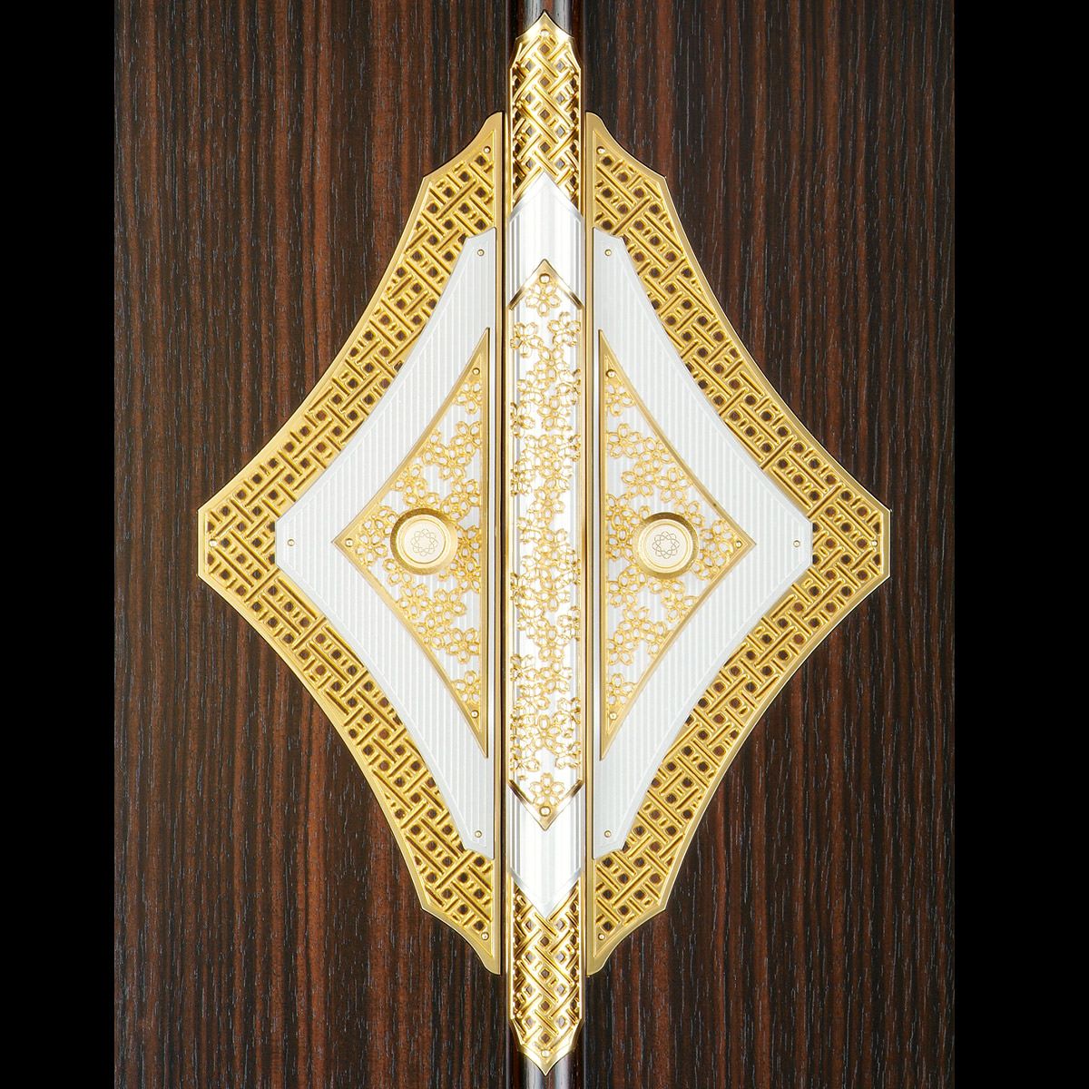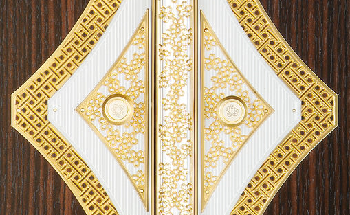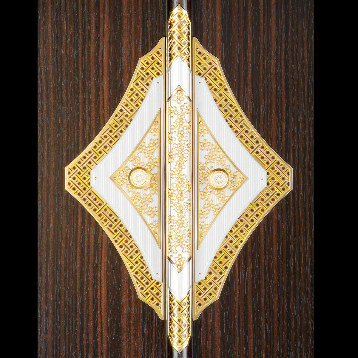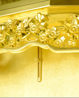 厨子金具は、このお仏壇用に特別に開発した金具です。金メッキとロジウムメッキのツートンカラーの幾何学模様とたて縞模様をベースに桜の花びらをあしらった斬新な中にも品位を感じる逸品です。