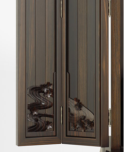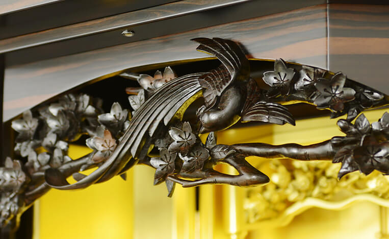 デビュー以来、人気を誇る尾長鳥の彫刻を欄間に採用。尾長鳥が桜の上空を優雅に舞っている様子を、本黒檀無垢材で立体的に彫り上げました。