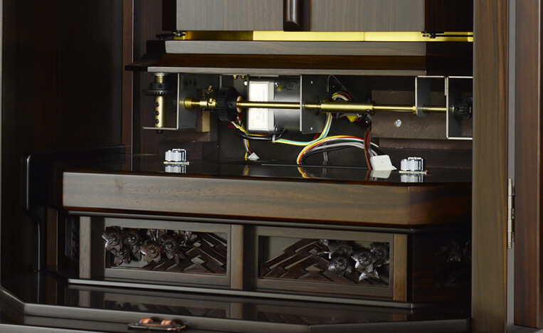 大切にしたのは厨子扉を開閉するモーターの位置。仏壇業界で主流の上置きモーターは、御本尊様の頭に機械を置いた形。目に見えない所にもこだわる金剛堂では、全てのお仏壇が御本尊様の下にモーターが置かれるように設計されています。