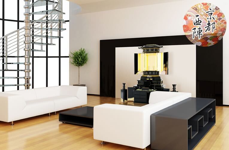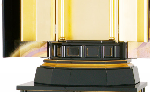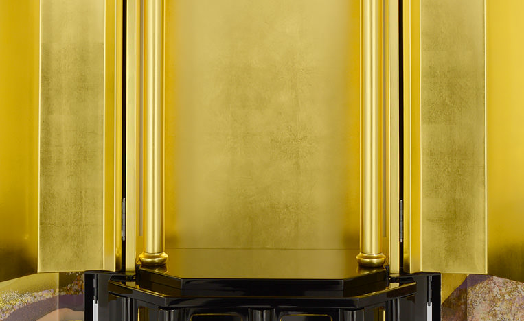 京都の風土に育まれた伝統、西陣織。その雅やかな美しき金箔は、至るところにに散りばめられ一面の春風をイメージしています。従来のお仏壇のイメージを一新させた息をのむ華麗な世界が祈りの瞬間を彩ります。
