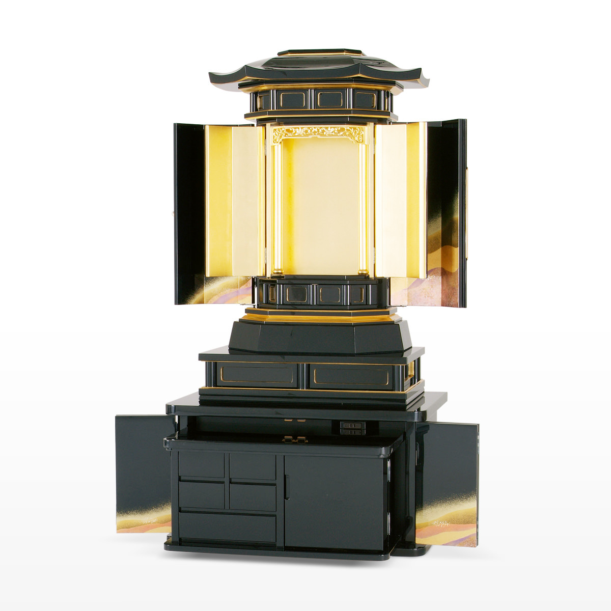 3.5尺黒塗収納式 さらなる高みへの追求が生み出した黒塗仏壇に、京都西陣仕様の純金銀箔と革新的でダイナミックなデザインを取り入れた六角厨子です。その独創性に満ち溢れた美しい一体感が新しいときめきを与えてくれます。